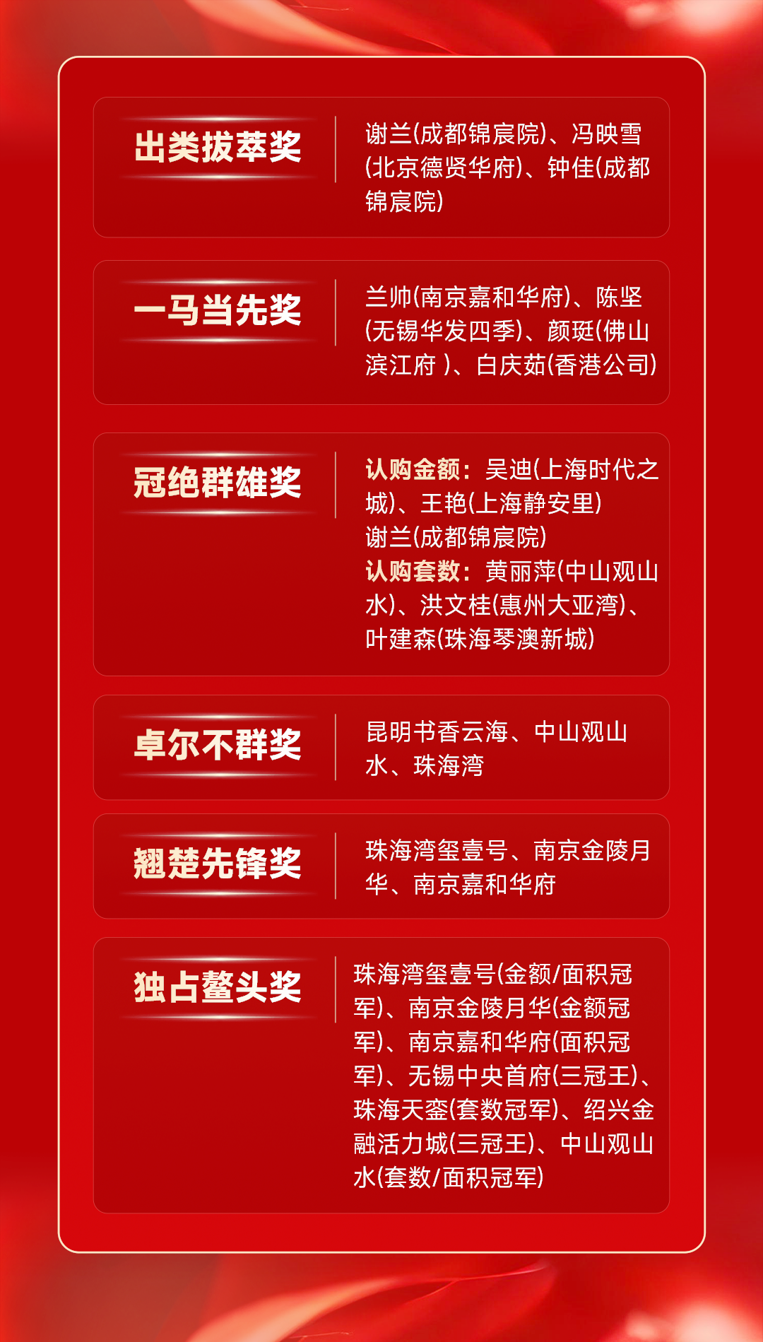 其中,出类拔萃奖奖励个人业绩1亿以上,个人业绩为全盘人均业绩3倍及以上的销售顾问。一马当先奖奖励项目超额完成年度销售指标、业绩5亿元以上,且四季度考核获得奖励的自操盘项目营销负责人。冠绝群雄奖奖励个人流量认购金额和套数分别位居全国前3名的销售顾问。卓尔不群奖奖励销售套数位居全国前3名的自操盘项目(不含车位)。翘楚先锋奖奖励销售金额位居全国前3名的自操盘项目。独占鳌头奖奖励在所处城市销售金额、套数或面积位居第1名的项目。